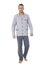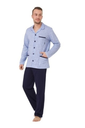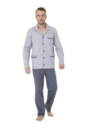 Wygodna piżama męska wykonana z wysokiej jakości bawełny. Koszula z długim rękawem, zapinana na guziki, z kołnierzykiem i kieszeniami. Spodnie długie, jednolite.